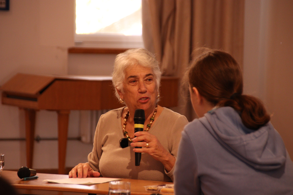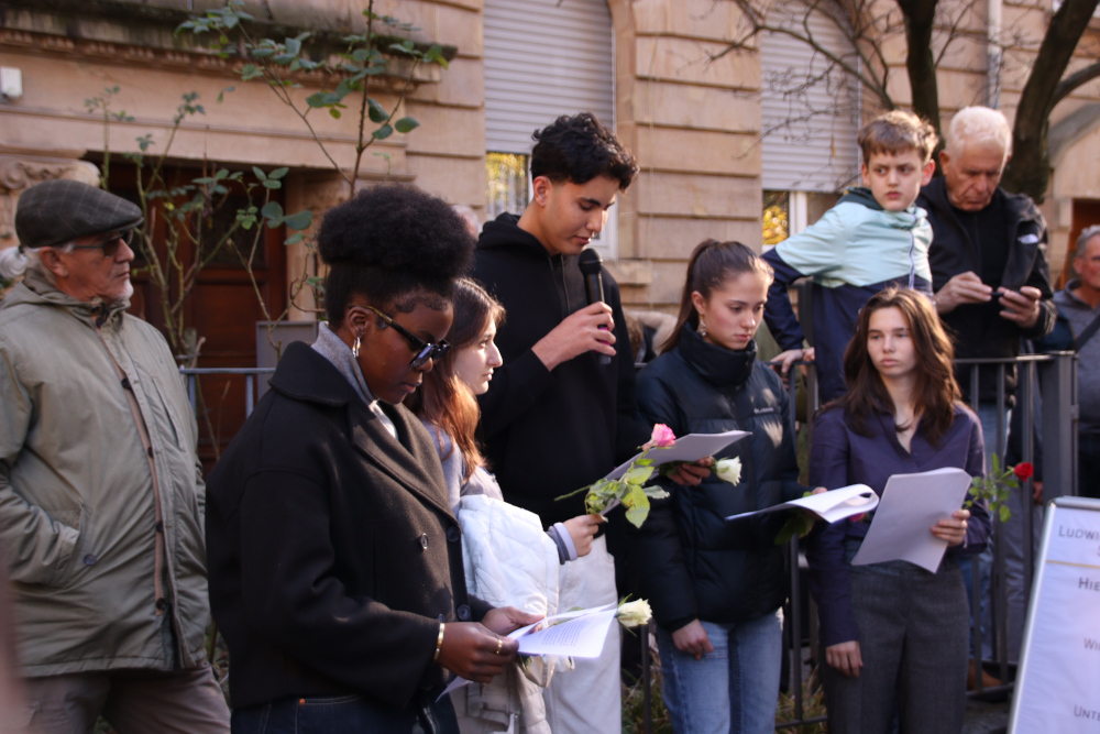 Geschichtskurse unserer Schule setzten sich unter der Leitung von Roland Gresch mit der Vergangenheit der Familie Strauss auseinander und trugen mit kurzen Texten und einem anschließenden Interview mit Prof. Dr. Shulamit Reinharz, der Tochter von Ilse Strauss, zur Zeremonie bei.