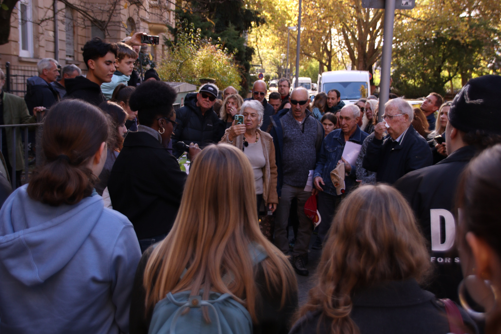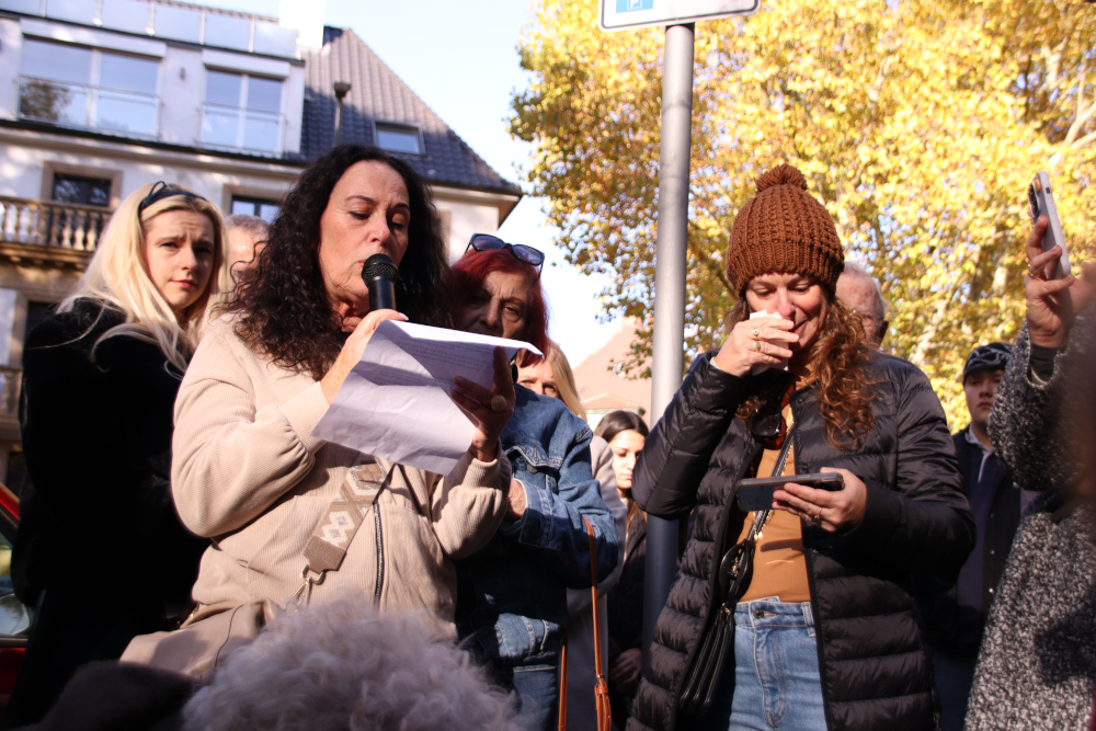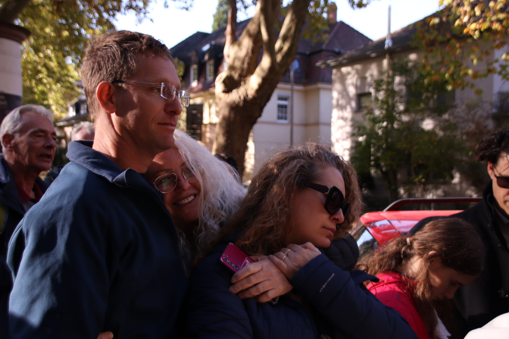 Bei der Verlegung halfen die Urenkel der drei Schwestern beim Einsetzen der mit Messingplatten versehenen Stolpersteine, während der Sohn von Liselotte und die Tochter von Eva Texte über ihre Mütter vortrugen.