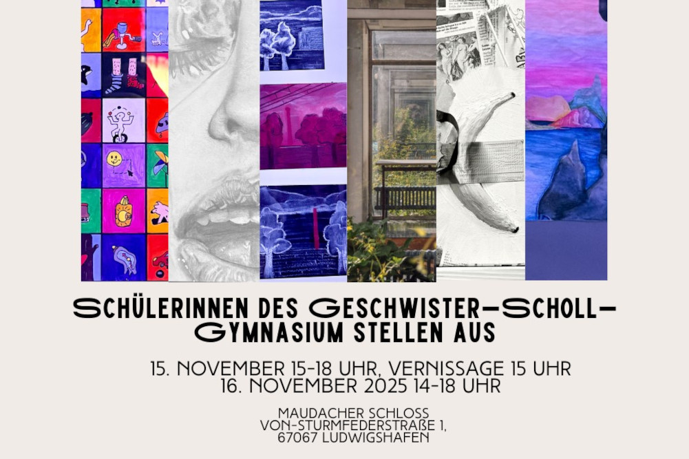 Vom 15.11. bis 16.11.2025 stellten sieben Schülerinnen des Geschwister-Scholl-Gymnasiums gemeinsam mit sieben freischaffenden Künstler*innen im Maudacher Schloss aus und begeisterten das Publikum mit einer vielfältigen Mischung aus Malerei, Zeichnung, Fotografie und Co.
