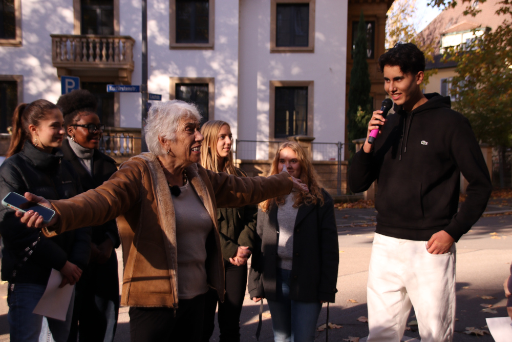 Geschichtskurse unserer Schule setzten sich unter der Leitung von Roland Gresch mit der Vergangenheit der Familie Strauss auseinander und trugen mit kurzen Texten und einem anschließenden Interview mit Prof. Dr. Shulamit Reinharz, der Tochter von Ilse Strauss, zur Zeremonie bei.
